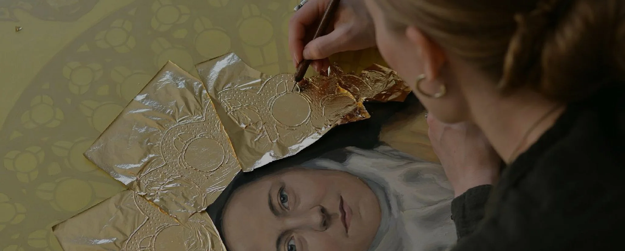 I thus had a moment of inspiration to use the Holy Face of Jesus for this piece, an image that could easily resonate with Word on Fire’s practice of evangelizing through images and media. The stories we have in the traditions of the veil of Veronica in the West and the Mandylion of King Abgar in the East, which were the first images Jesus left of himself, supply the perfect examples for this type of work. In my painting, Jesus is crowned with thorns, painted from a crown of thorns my mother gave me to use in my art, and the thorns are long and severe. Jesus’ beautiful face, the face of greatest love, drips with his precious blood, and light forms a halo around his face. The veil is trimmed with a delicate lace to reference the embroidery and lace work Thérèse did in her life, which she probably learned from her mother, St. Zélie Martin, who owned a lace business.